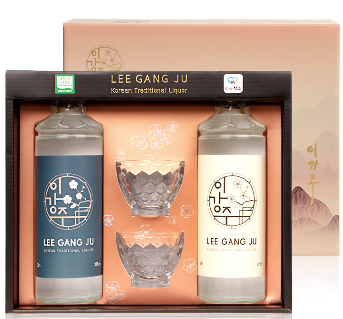 이강주 38도는 개별로 판매되지 않고 혼합세트로 25도 1병, 38도 1병 총 2병과 잔 2개로 판매하고 있습니다.