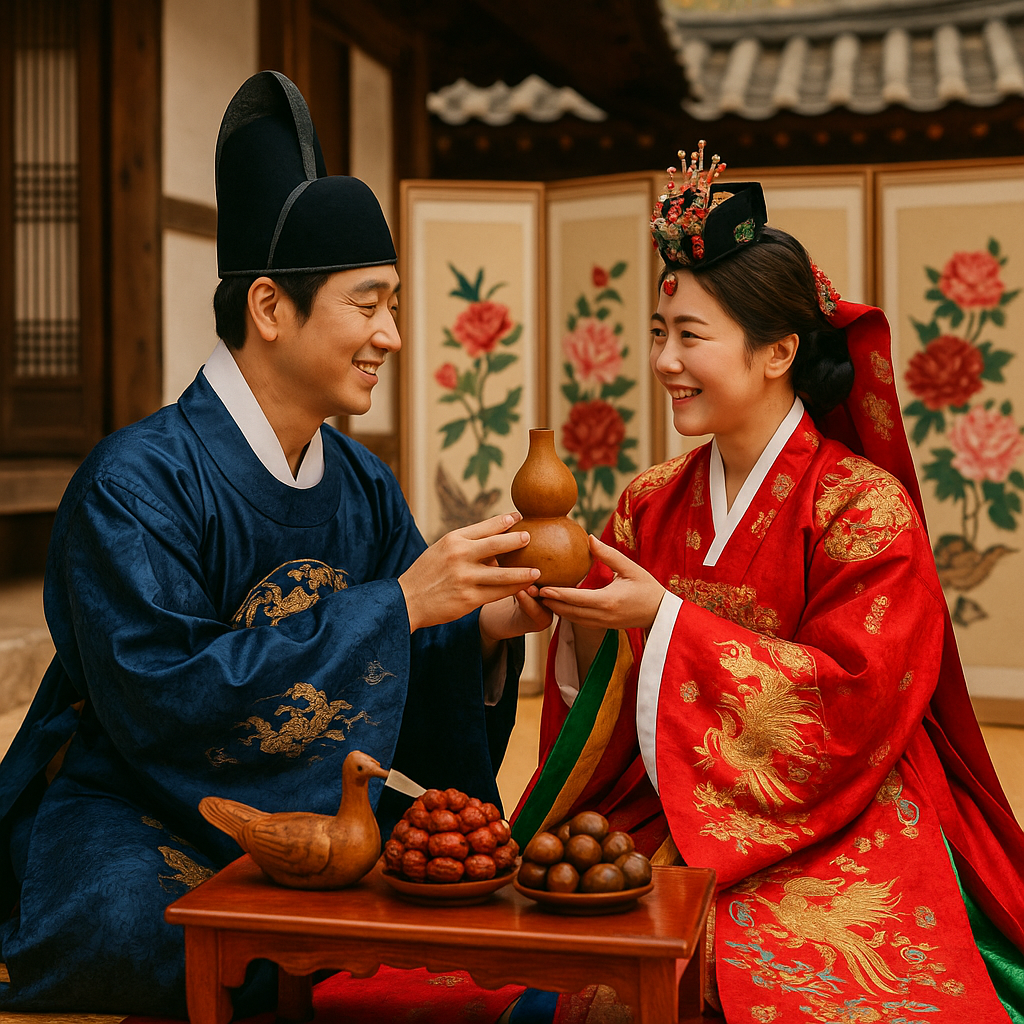 • 합근례(合巹禮): 신랑과 신부가 표주박을 쪼개 만든 잔으로 술을 나누어 마시는 절차. 이는 두 사람이 하나가 됨을 상징합니다.
