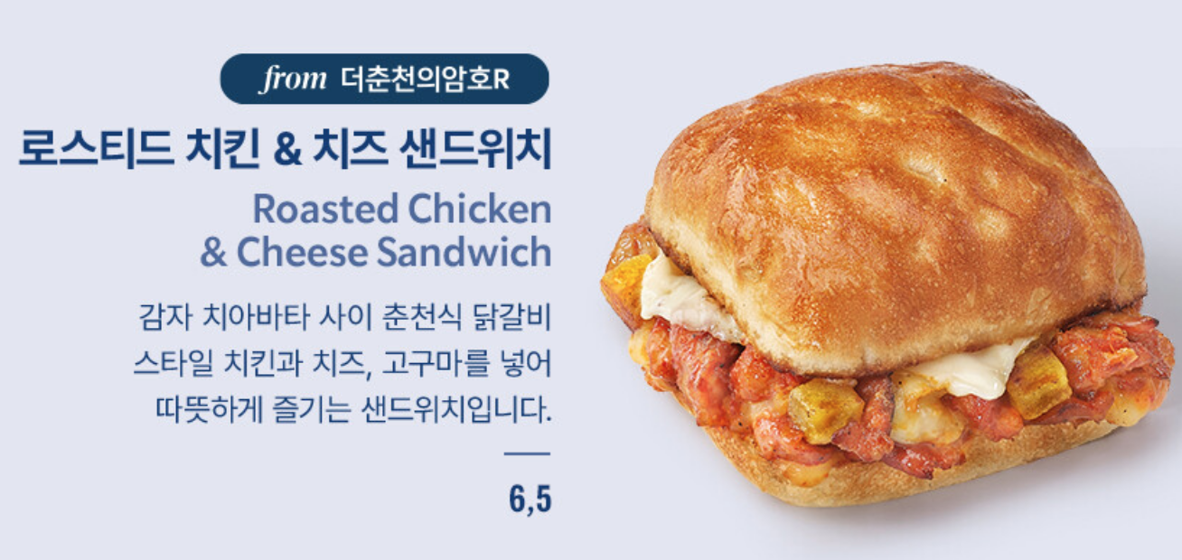 감자 치아바타 사이에 강원도 춘천 닭갈비를 넣어 만든 스타일로 치킨과 치즈 조합에 덧 붙여 고구마까지 넣어 따뜻하고 담백하게 즐실 수 있는 샌드위치입니다. 춘천식 닭갈비의 스타일로 우리나라만의 색깔의 로스티드 치킨 치즈 샌드위치를 만나보실 수 있습니다.