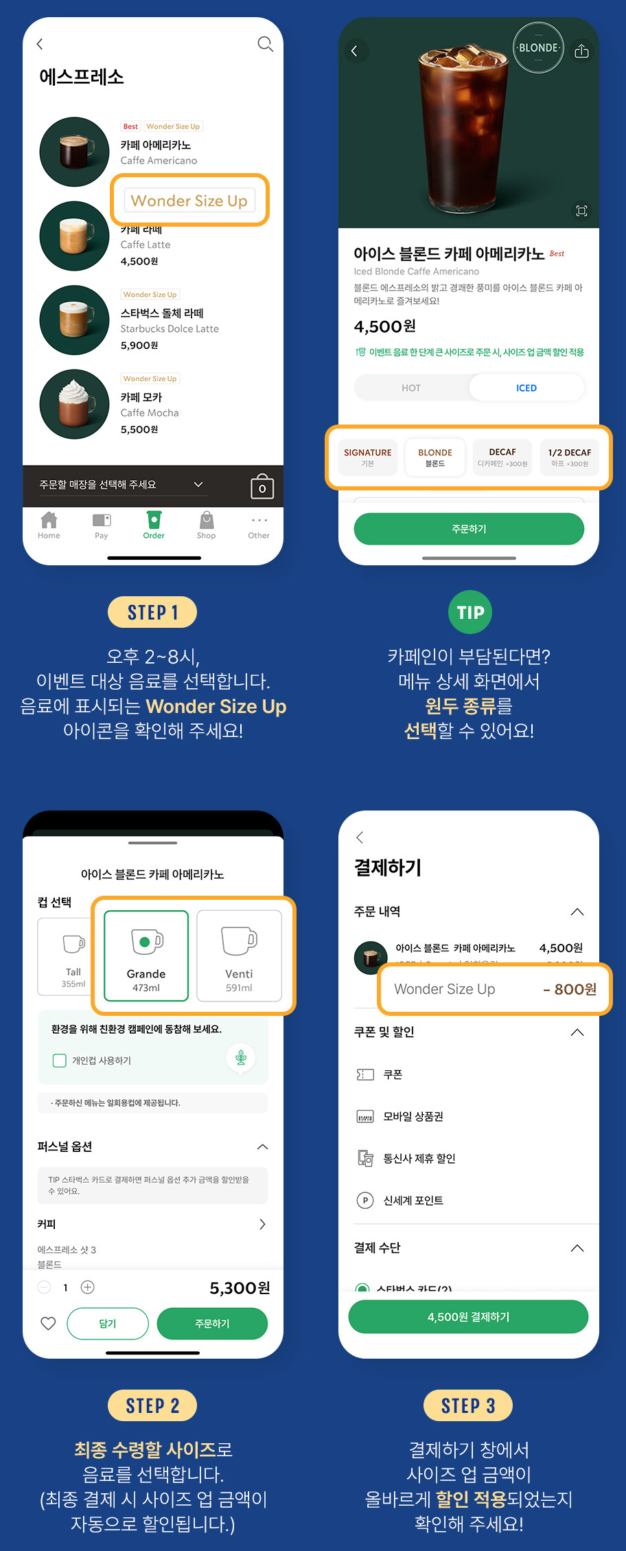 4.본 이벤트는 기간 내 오후 2~8시 사이 구매한 대상 음료에만 적용되며, 사이렌 오더를 통한 주문은 등록된 스타벅스 카드를 보유한 스타벅스 리워드 회원(웰컴/그린/골드)만 가능합니다. 사이렌 오더를 통한 이벤트 적용은 사이렌 오더 내 [결제하기 창 진입 및 결제 완료 후, 매장 주문 전송까지 완료된 시점]을 기준으로 하며, 매장의 입점 시간, APP의 실행 시간, 장바구니에 담은 시간, DT존 픽업 주문의 경우 원거리에서 결제를 먼저 완료한 시점 등과는 관계가 없습니다. 최종 결제 전, 사이즈 업 혜택 적용 여부를 반드시 확인하시기 바랍니다.
