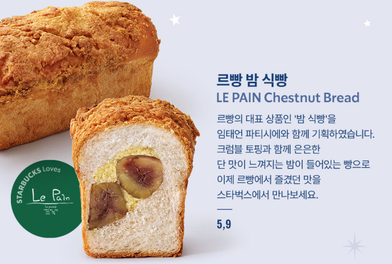 르빵의 대표 상품인 "밤 식빵"을 임태언 파티시와 함께 스타벅스가 기획한 밤 식빵은 크럼블 토핑과 함께 통 밤이 들어가 있는 식빵으로 은은한 단 맛이 느낄 수 있으며 르빵에서 즐겼던 맛을 스타벅스에서도 만나볼 수 있습다. 밤 식빵과 함께 아메리카노가 잘 어울리지만 겨울철 우유가 들어간 라떼와도 너무나 잘 어울리는 "스타벅스 밤식빵" 입니다.
