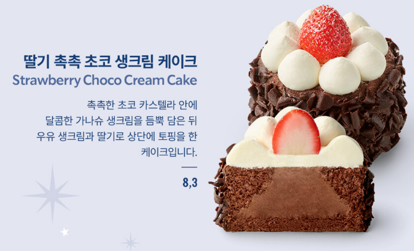 촉촉한 초코 카스테라 안에 달콤한 가나슈 생크림이 듬뿍 담은 뒤 우유 생크림고 딸기로 상단에 토핑을 한 케이크고 달콤 녹진한 초코오 담백한 생크림을 맛을 느껴보고 싶은 사람들에게 추천합니다. 겨울철 딸기 토핑으로 따뜻한 아메리카노를 함께 마신다면 겨울을 한껏 느낄수 있는 딸리 촉촉 초고 생크림 케이크