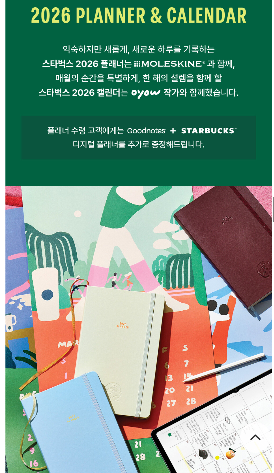 | 스타벅스 2026 플래너 (Moleskine 콜라보) | 감성 + 실용성 높은 연간+월간 플래너 구성 |