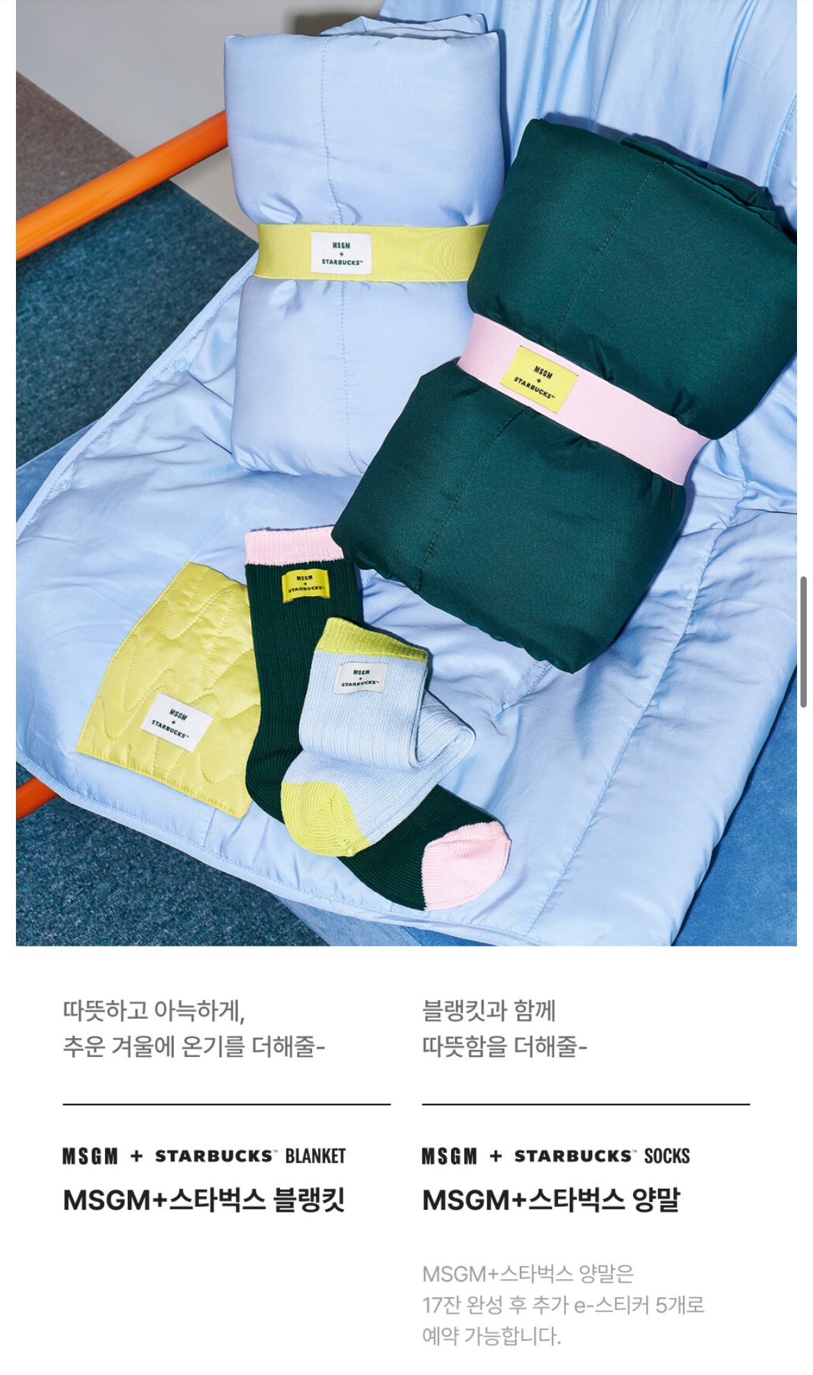 | MSGM + 스타벅스 블랭킷 (그린/스카이블루) | 가벼운 충전재, 포근한 촉감, 포인트 포켓 디자인 |