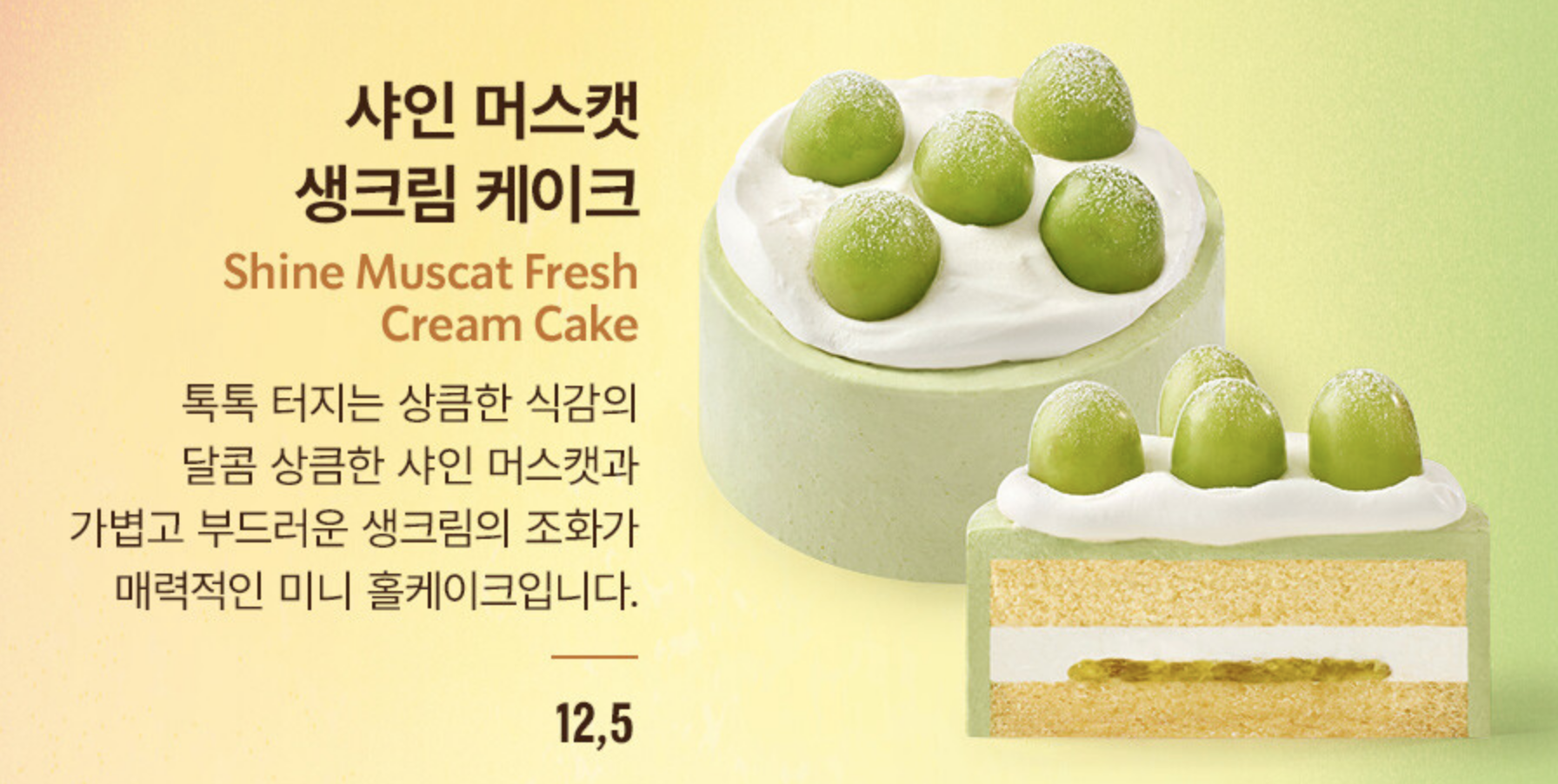 - 특징: 톡톡 터지는 샤인머스캣의 달콤 상큼한 풍미와 가볍고 부드러운 생크림이 어우러진 미니 홀케이크. 시원한 과일 향이 여름철 상쾌함을 더해줍니다.
