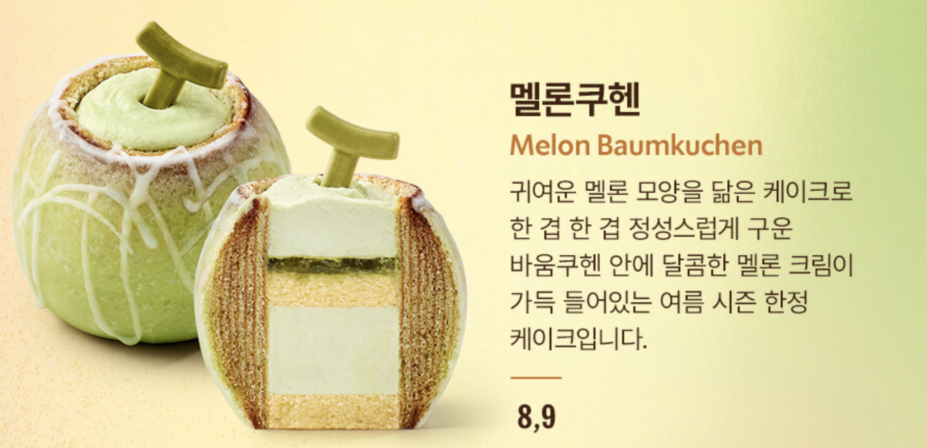 | 케이크 | 멜론쿠헨 | 멜론 크림 바움쿠헨 | 여름 시즌 한정 디저트 |