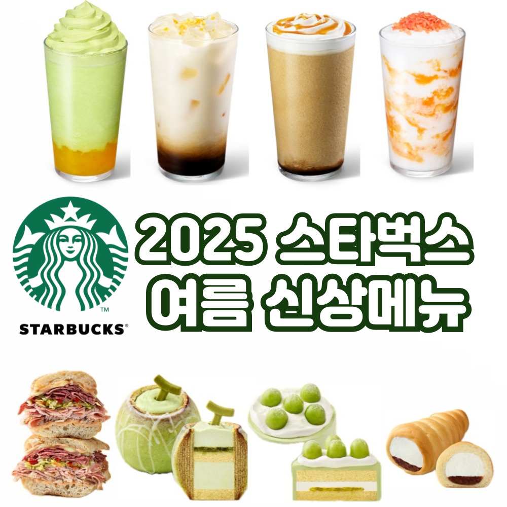 2025 스타벅스 여름 신상메뉴 총정리! 더 멜론 오브 멜론 프라푸치노, 자몽 망고 코코 프라푸치노, 카페 브륄레 프라푸치노, 로스티드 마카다미아 라떼, 렌위치 NY 샌드위치, 멜론쿠헨, 샤인머스캣 생크림 케이크까지. 실제 후기와 함께 여름 시즌 한정 메뉴를 소개합니다.