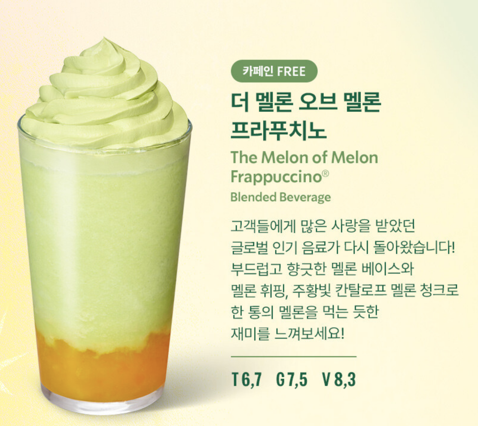 - 특징: 부드럽고 향긋한 멜론 베이스에 멜론 휘핑, 주황빛 칸탈로프 멜론 청크가 더해져 한 잔에 ‘멜론 한 통’을 먹는 듯한 재미를 느낄 수 있는 음료. 카페인 FREE라서 남녀노소 부담 없이 즐길 수 있습니다.