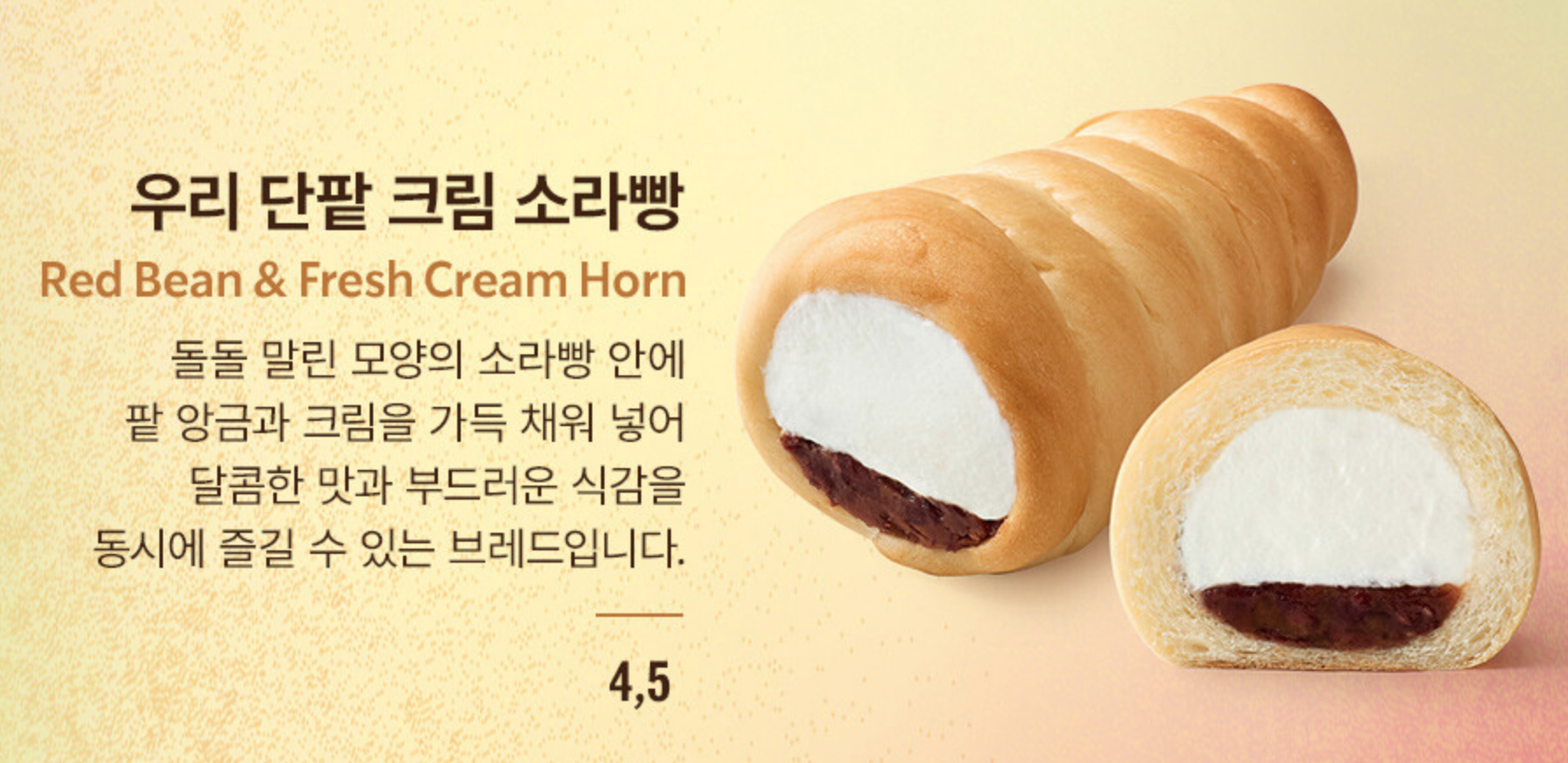 | 브레드 | 우리 단팥 크림 소라빵 | 단팥 + 생크립 | 누구나 좋아할 수 있는 맛 |