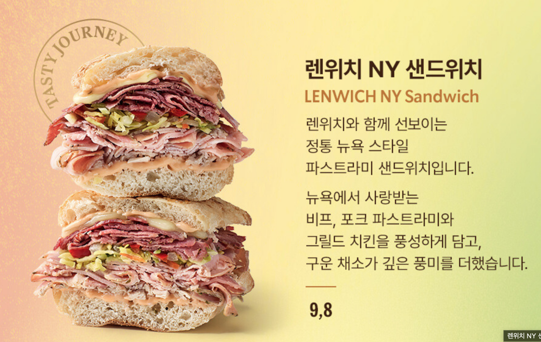 - 특징: 뉴욕 현지 인기 샌드위치 브랜드 ‘렌위치’와 협업한 정통 뉴욕 스타일 파스트라미 샌드위치. 비프, 포크 파스트라미와 그릴드 치킨, 구운 채소가 풍성하게 들어 있어 한 끼 식사로 충분합니다.