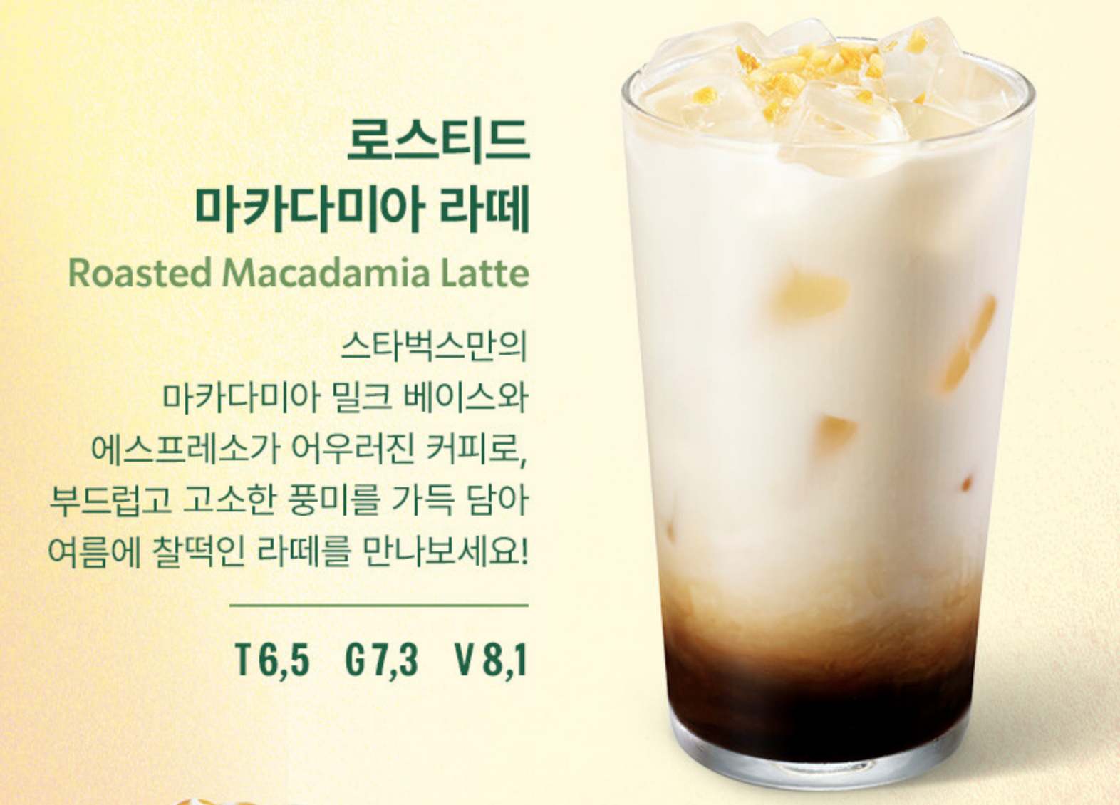 - 특징: 스타벅스만의 마카다미아 밀크 베이스와 에스프레소가 어우러진 라떼. 부드럽고 고소한 풍미가 여름철에도 부담 없이 즐기기 좋은 음료예요.