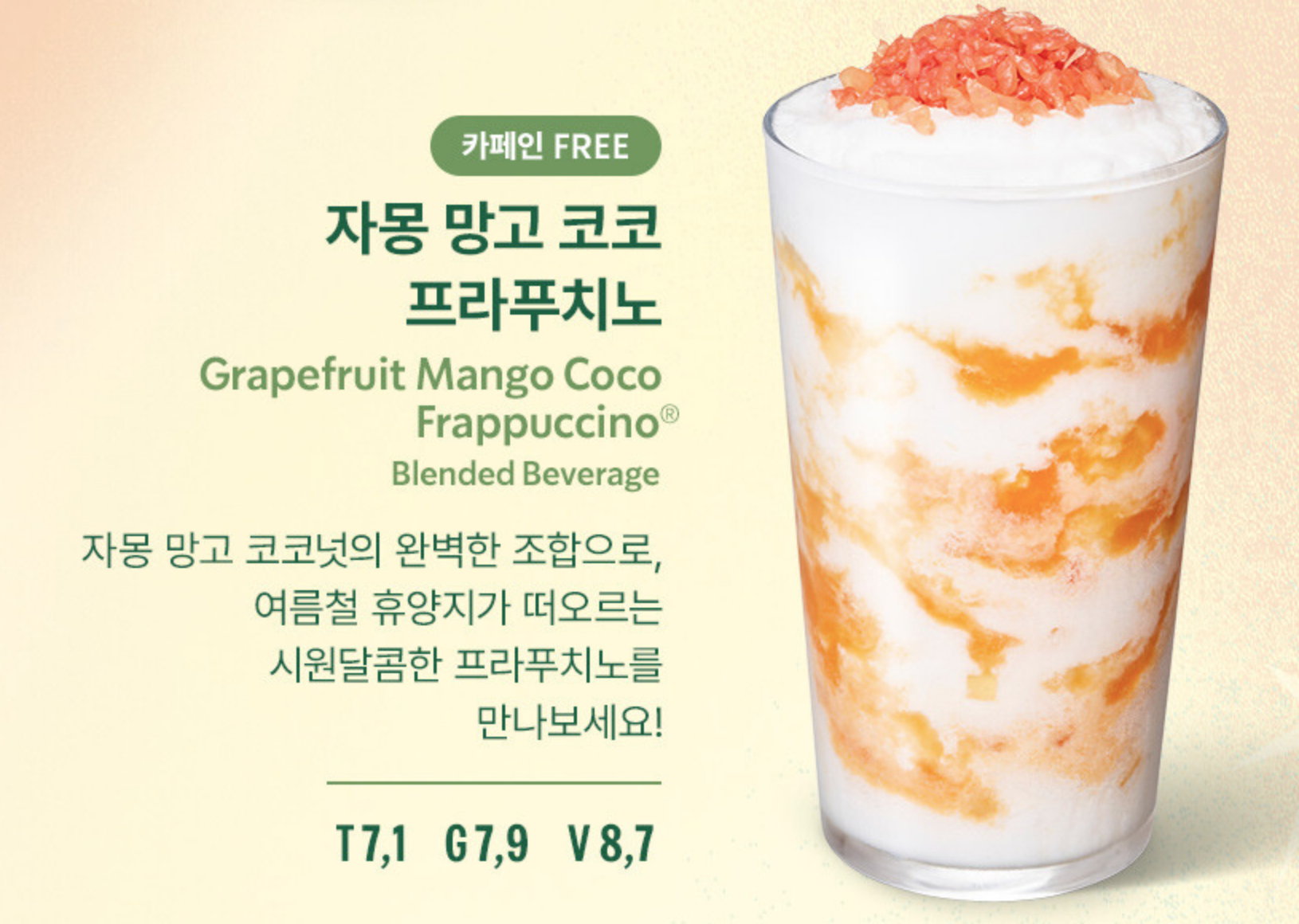 | 프라푸치노 | 자몽 망고 코코 | 자몽+망고+코코넛 조화 | 트로피컬 감성 |