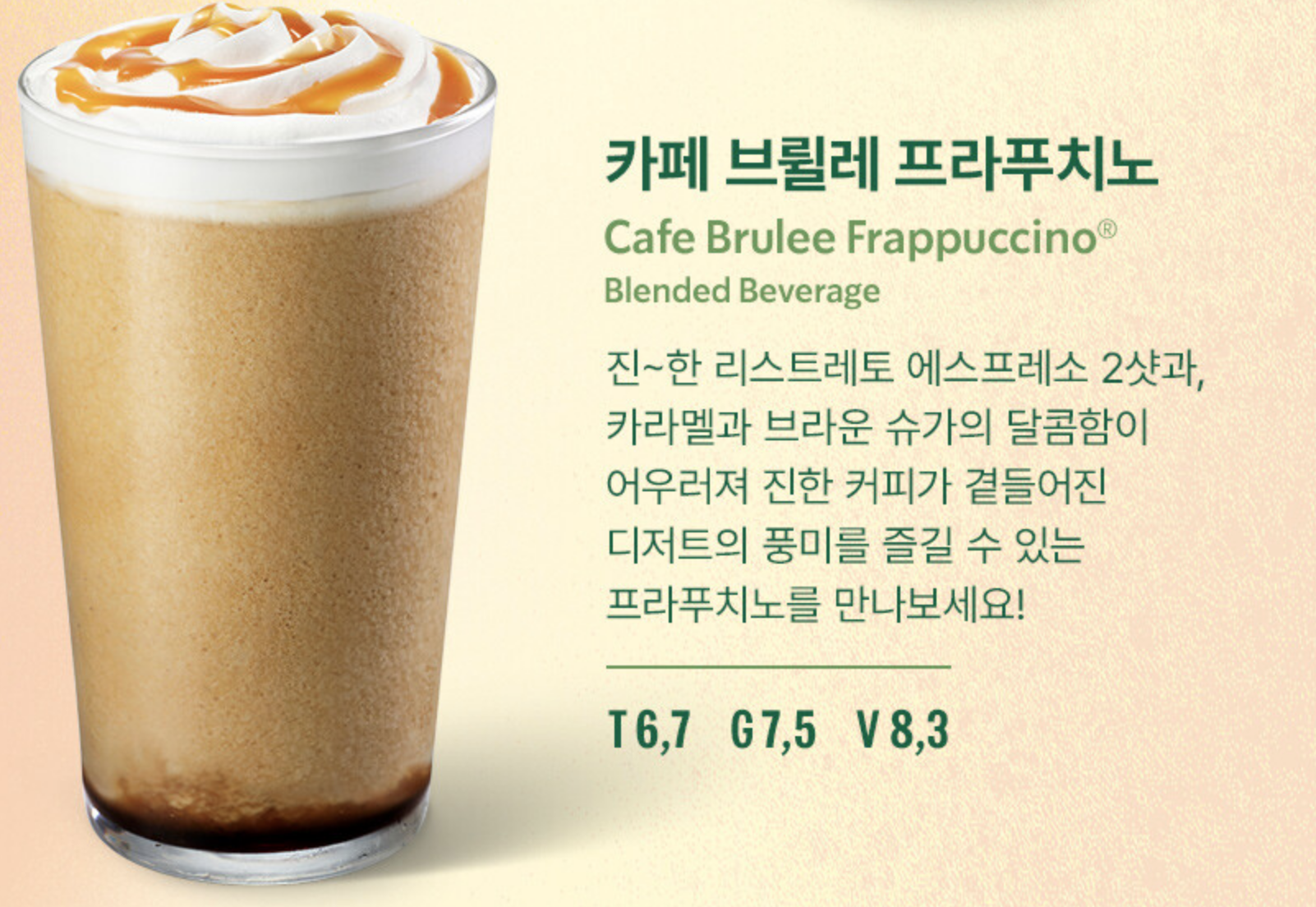 | 프라푸치노 | 카페 브륄레 | 에스프레소+카라멜 | 진한 디저트풍 음료 |