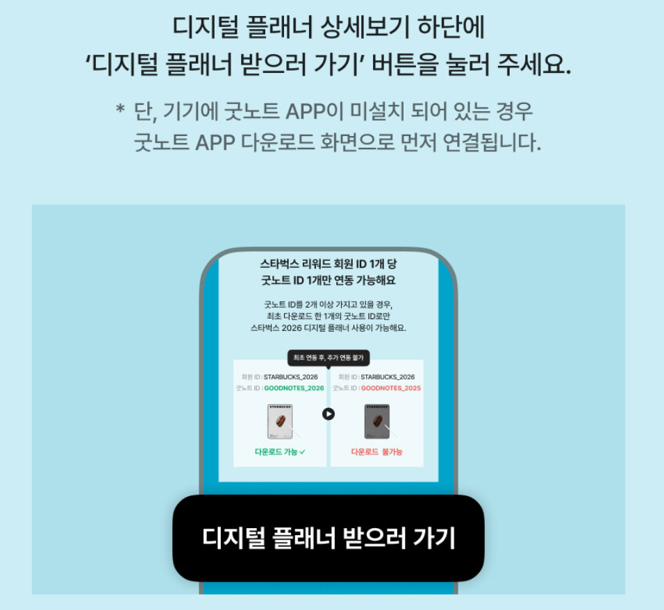 스타벅스 2026 디지털 플래너는 스타벅스 앱 + Goodnotes 앱 연동을 통해 쉽게 사용할 수 있는 형태
